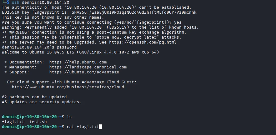 I log in via ssh and voila we have a shell and also capture our first flag.