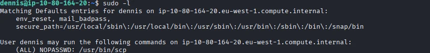 Based on the .bash_history file I find a clue to where to find the fifth flag which requires sudo rights so I check the users’ sudo rights sudo -l.