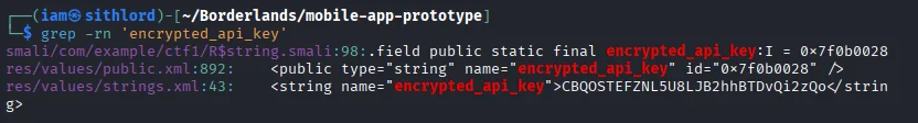 From the decompiler output there is a variable called encrypted_api_key. After a little research I decide to reverse engineer the apk using apktool and search for the variable name which yields a positive result.
