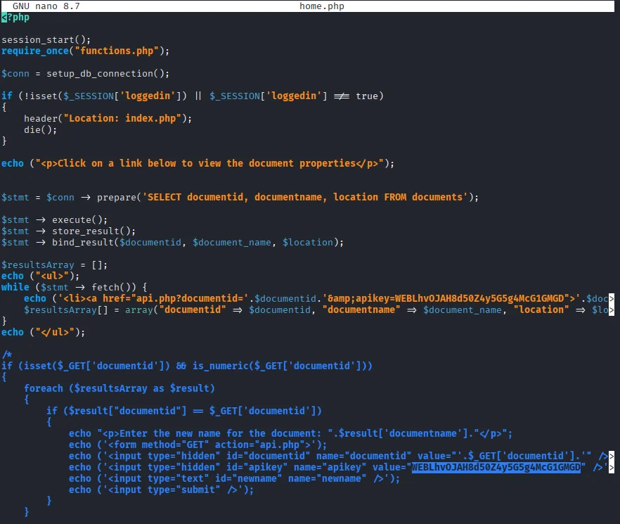 Reading the home.php file I stumble across the web app flag and we’ve drawn first blood!!.