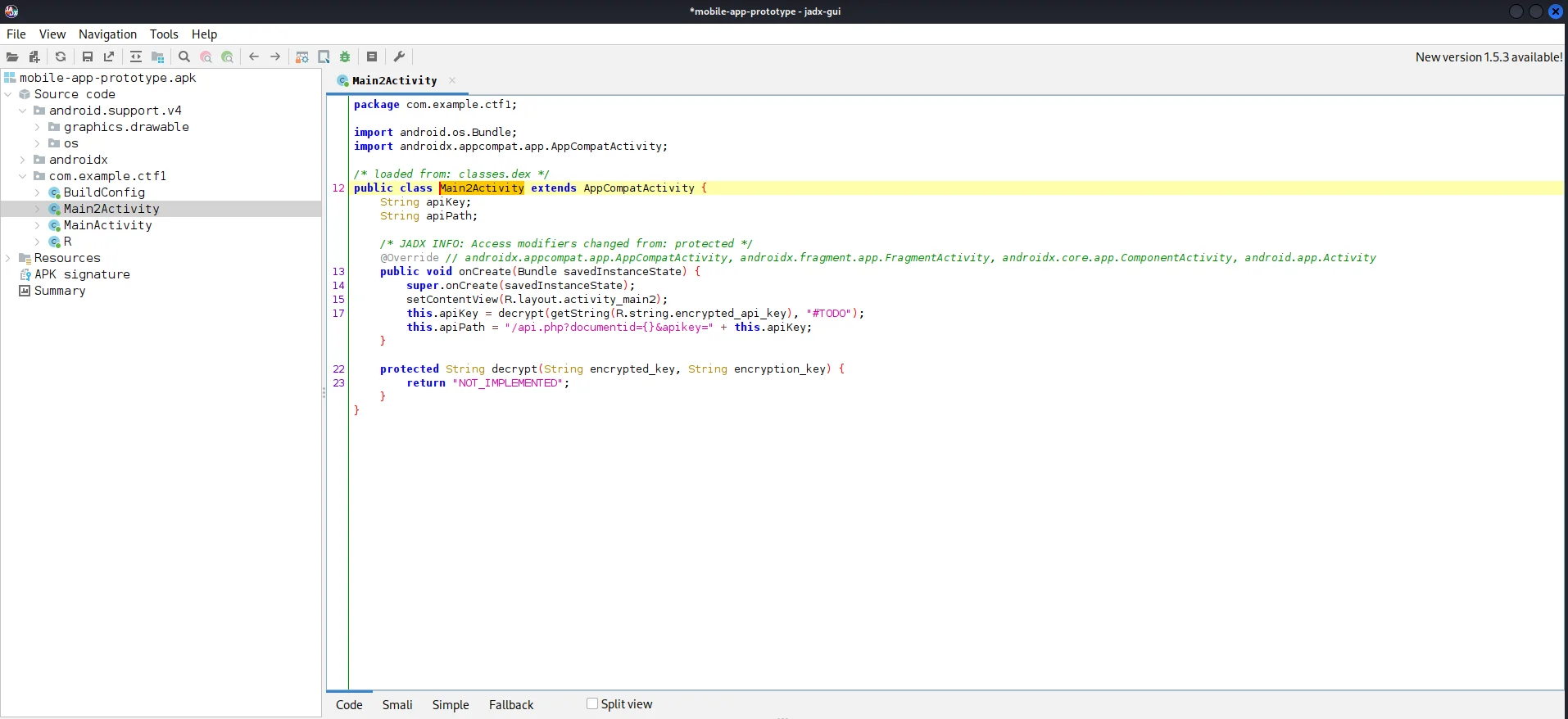 Moving forward to enumerate the APK we downloaded.Our task is to find and decrypt the API key which is a flag.First I use jadx-gui a java source code decompiler to read the source code.