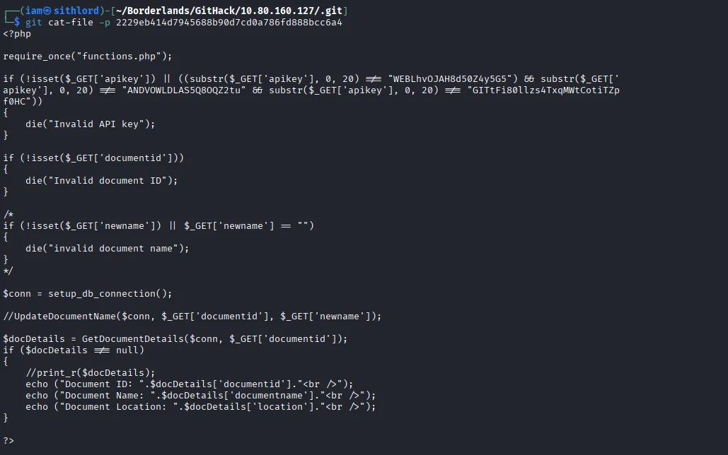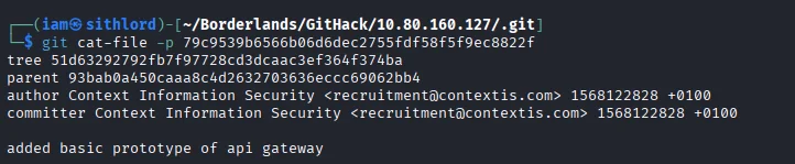 Reading through we notice the author removed sensitive data on the object b2f776a52fe81a731c6c0fa896e7f9548aafceab so let’s try looking at object 79c9539b6566b06d6dec2755fdf58f5f9ec8822f to see if we can get this sensitive data. Next I create a dummy git folder in the same GitHack directory where server files were pulled to dump object data. To extract the object from the site I use the following url http://10.80.160.127/.git/objects/79/c9539b6566b06d6dec2755fdf58f5f9ec8822f
