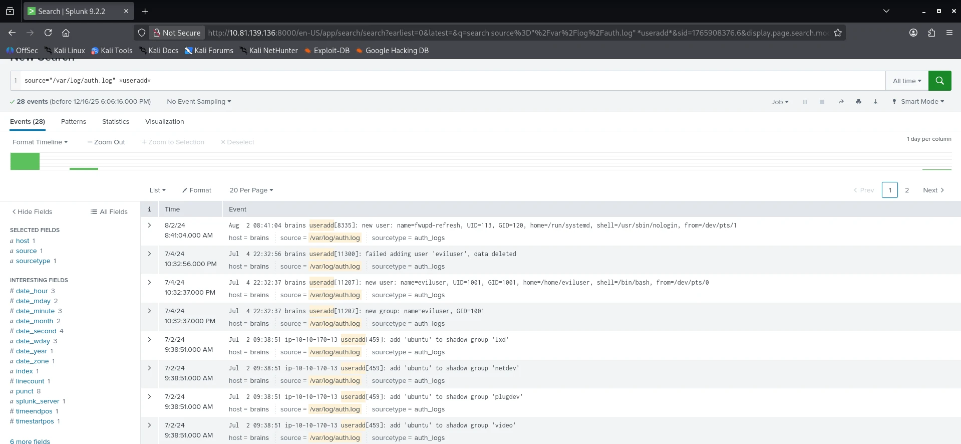 We can find this by searching the /var/log/auth.log source for the useradd string with the query: source="/var/log/auth.log" *useradd*.