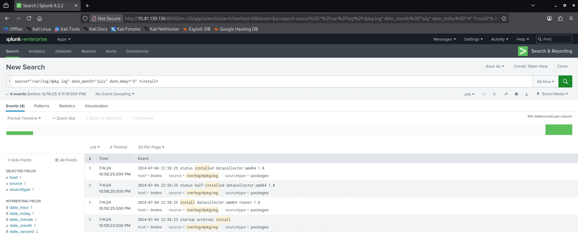 To find the answer, we can look for packages installed around the same timeframe as the user creation using the /var/log/dpkg.log source with the query: source="/var/log/dpkg.log" date_month="july" date_mday="4" *install*.