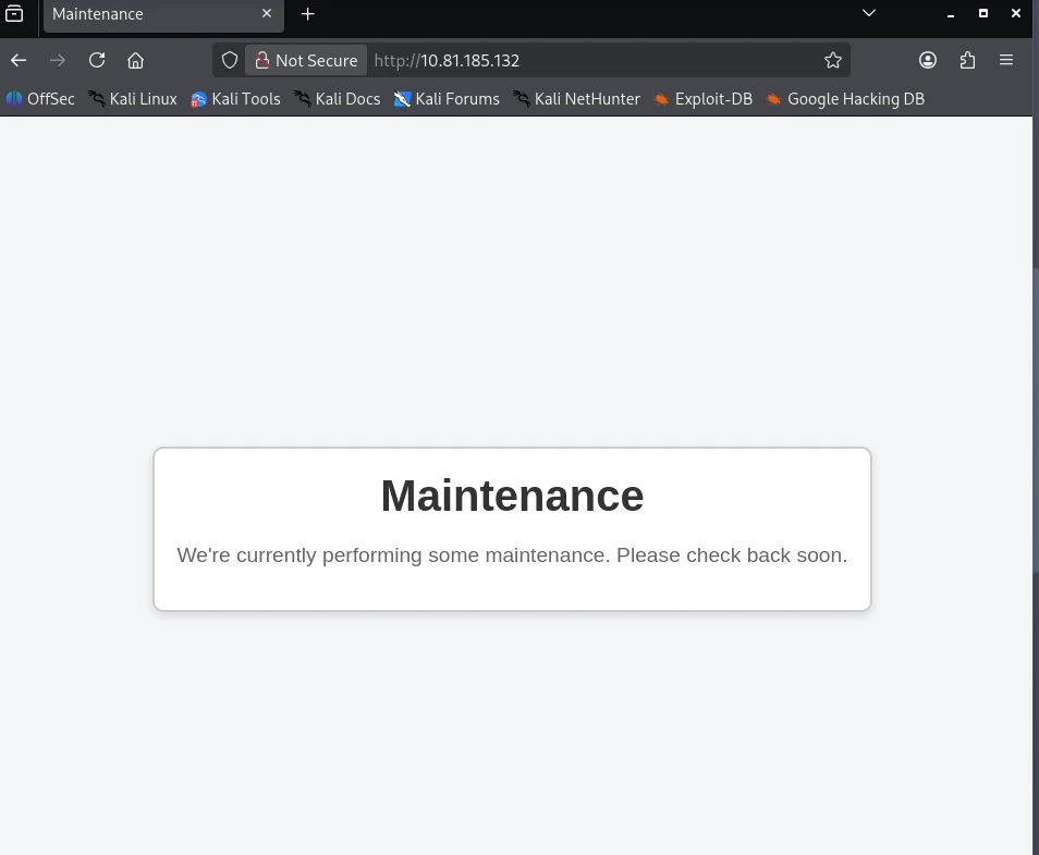 Upon visiting http://10.81.185.132/, we encounter a simple page displaying a “Maintenance” message.