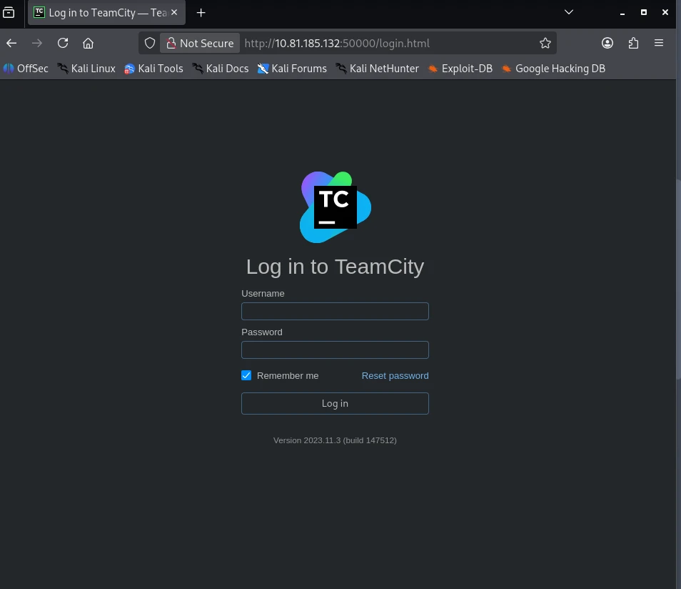 Accessing http://10.81.185.132:50000/, we find a TeamCity Version 2023.11.3 (build 147512) installation.