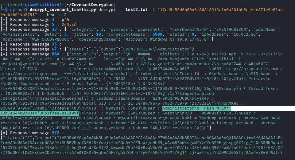 What is the Administrator NTLM hash that the attacker found Looking back at the virustotal results,the threat is related to covenant and after a little research I come across the CovenantDecryptor which is designed to decrypt the communication data of the covenant traffic. The following section from the CovenantDecryptor repository shows how the covenant communication is setup.