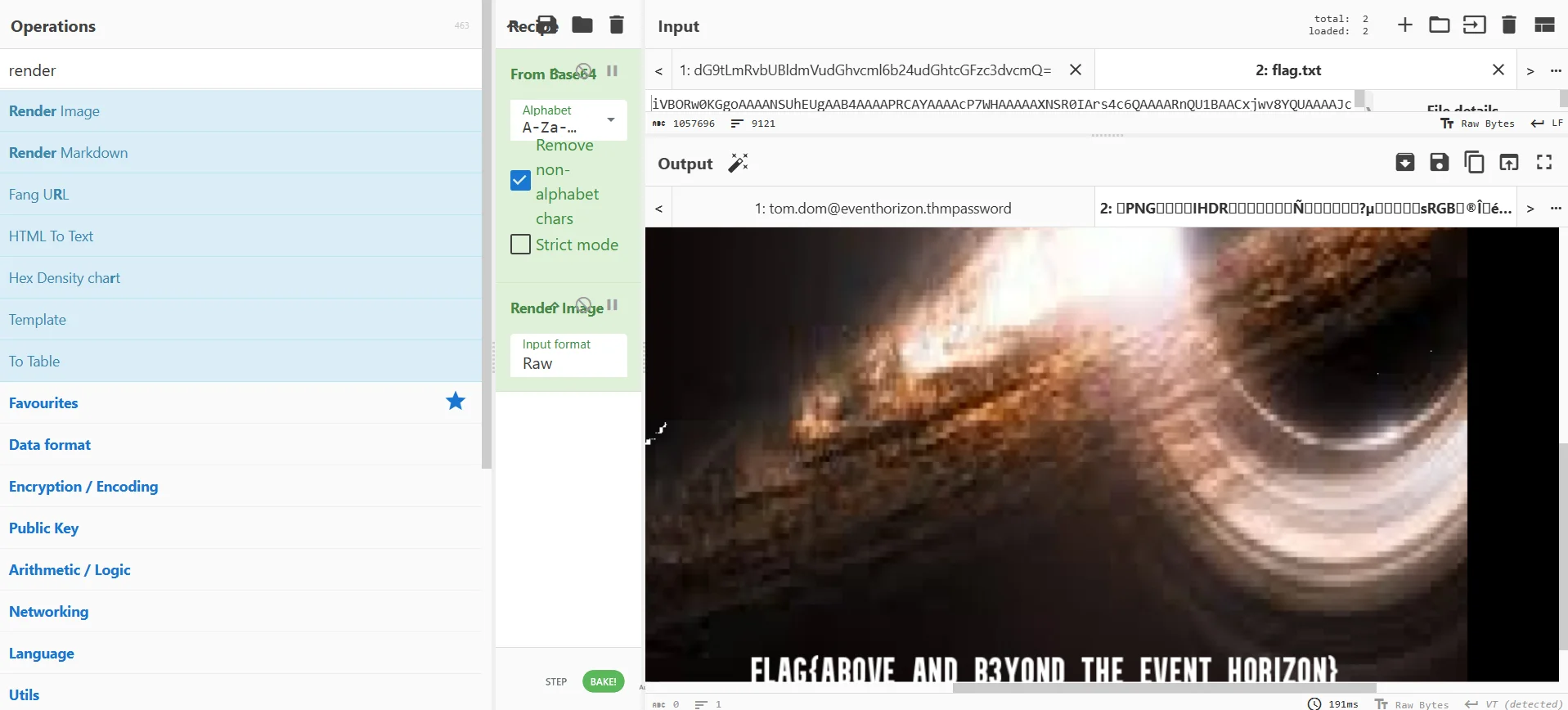 What is the flag From our previous communication decryption,we noticed that message 972 contains a big chunk of base64 encoded data.Using cyberchef to decode it we see it is actually an image by the magic bytes.Using the Render recipe it is a capture of the desktop which also contains the final flag at the bottom.