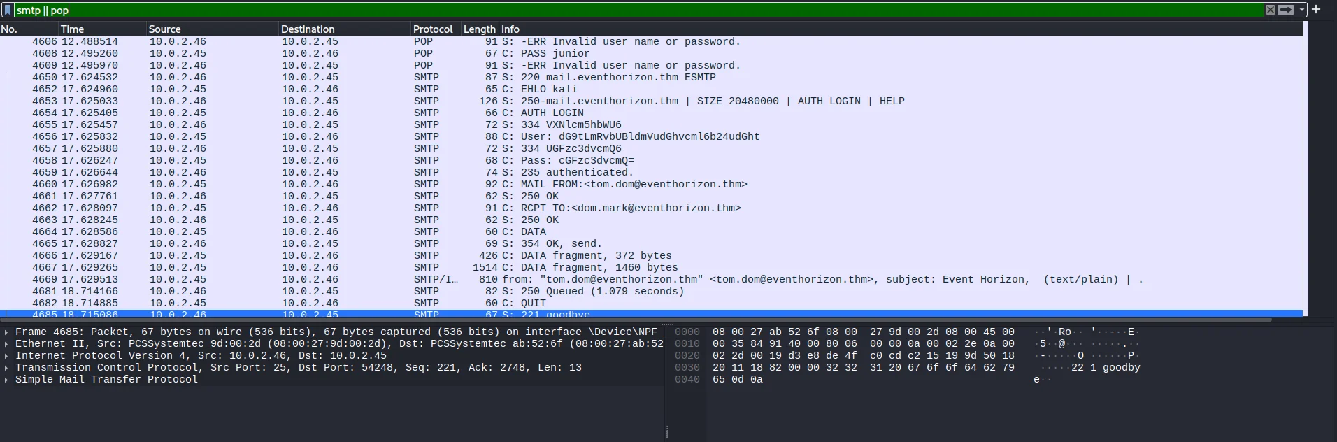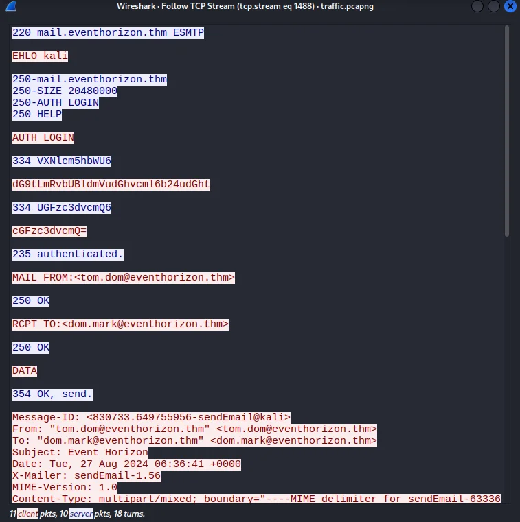 The attacker was able to find the correct pair of credentials for the email service.What were they? From the beginning we are given two files to analyze powershell.DMP and traffic.pcapng Using wireshark to scan the given pcapng file I use a filter pop || smtp to find any brute force happening.Noticing some base64 data I follow the TCP stream which reveals AUTH login details that upon decoding give us our answer.