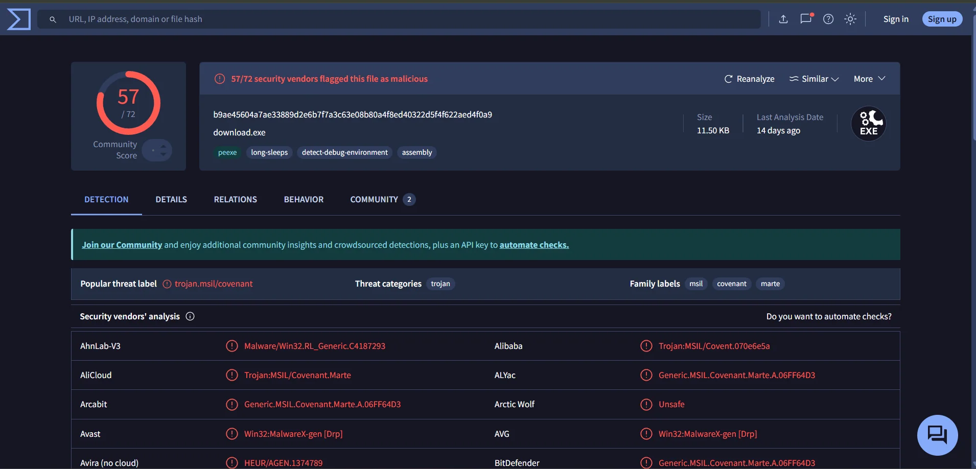 Uploading the script to virus total we see it is a known malicious file in the wild and is related to Covenant.