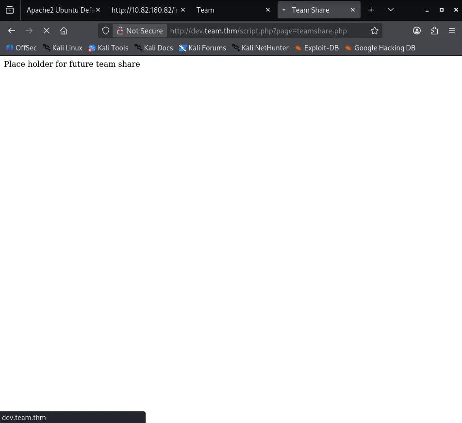 Again we add the hostname dev.team.thm to our /etc/hosts . Visiting the site we get a placeholder link to team share.Clicking on it we are redirected to dev.team.thm/script.php?page=teamshare.php