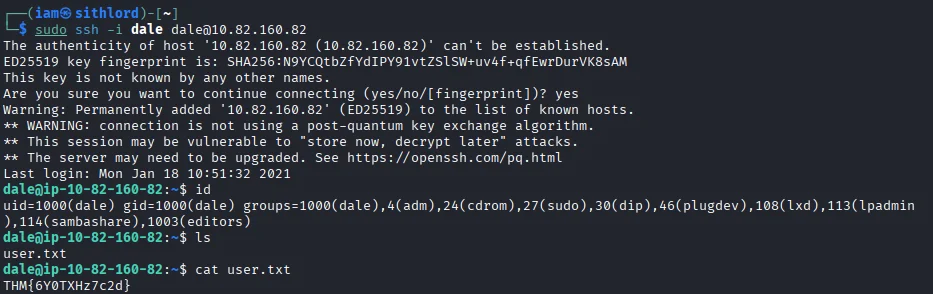 Copying the key to my box and editing out the hash sign on every newline and giving the file write permissions we login via ssh and gain a shell as the user dale We also capture our first flag