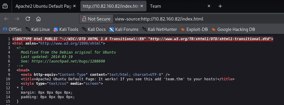 Checking the page source incase of any clues we find an instruction to add team.thm to our hosts file.